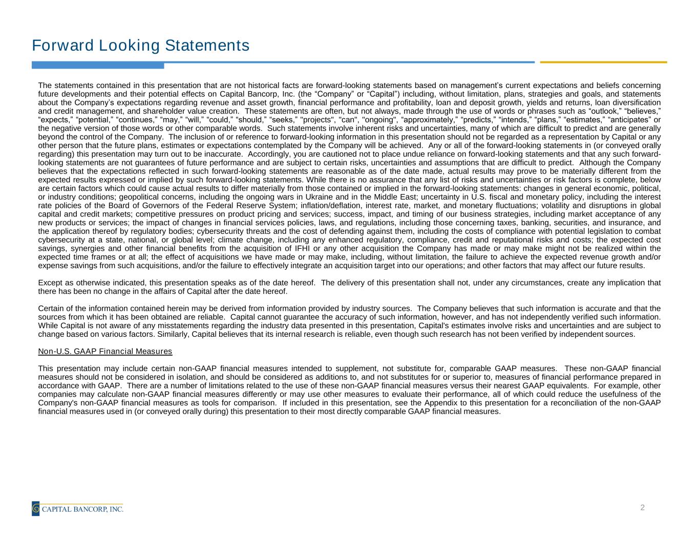 Forward Looking Statements The statements contained in this presentation that are not historical facts are forward-looking statements based on management’s current expectations and beliefs concerning future developments and their potential effects on Capital Bancorp, Inc. (the “Company” or “Capital”) including, without limitation, plans, strategies and goals, and statements about the Company’s expectations regarding revenue and asset growth, financial performance and profitability, loan and deposit growth, yields and returns, loan diversification and credit management, and shareholder value creation. These statements are often, but not always, made through the use of words or phrases such as “outlook,” “believes,” “expects,” “potential,” “continues,” “may,” “will,” “could,” “should,” “seeks,” "projects", "can", "ongoing", “approximately,” “predicts,” “intends,” “plans,” “estimates,” “anticipates” or the negative version of those words or other comparable words. Such statements involve inherent risks and uncertainties, many of which are difficult to predict and are generally beyond the control of the Company. The inclusion of or reference to forward-looking information in this presentation should not be regarded as a representation by Capital or any other person that the future plans, estimates or expectations contemplated by the Company will be achieved. Any or all of the forward-looking statements in (or conveyed orally regarding) this presentation may turn out to be inaccurate. Accordingly, you are cautioned not to place undue reliance on forward-looking statements and that any such forward- looking statements are not guarantees of future performance and are subject to certain risks, uncertainties and assumptions that are difficult to predict. Although the Company believes that the expectations reflected in such forward-looking statements are reasonable as of the date made, actual results may prove to be materially different from the expected results expressed or implied by such forward-looking statements. While there is no assurance that any list of risks and uncertainties or risk factors is complete, below are certain factors which could cause actual results to differ materially from those contained or implied in the forward-looking statements: changes in general economic, political, or industry conditions; geopolitical concerns, including the ongoing wars in Ukraine and in the Middle East; uncertainty in U.S. fiscal and monetary policy, including the interest rate policies of the Board of Governors of the Federal Reserve System; inflation/deflation, interest rate, market, and monetary fluctuations; volatility and disruptions in global capital and credit markets; competitive pressures on product pricing and services; success, impact, and timing of our business strategies, including market acceptance of any new products or services; the impact of changes in financial services policies, laws, and regulations, including those concerning taxes, banking, securities, and insurance, and the application thereof by regulatory bodies; cybersecurity threats and the cost of defending against them, including the costs of compliance with potential legislation to combat cybersecurity at a state, national, or global level; climate change, including any enhanced regulatory, compliance, credit and reputational risks and costs; the expected cost savings, synergies and other financial benefits from the acquisition of IFHI or any other acquisition the Company has made or may make might not be realized within the expected time frames or at all; the effect of acquisitions we have made or may make, including, without limitation, the failure to achieve the expected revenue growth and/or expense savings from such acquisitions, and/or the failure to effectively integrate an acquisition target into our operations; and other factors that may affect our future results. Except as otherwise indicated, this presentation speaks as of the date hereof. The delivery of this presentation shall not, under any circumstances, create any implication that there has been no change in the affairs of Capital after the date hereof. Certain of the information contained herein may be derived from information provided by industry sources. The Company believes that such information is accurate and that the sources from which it has been obtained are reliable. Capital cannot guarantee the accuracy of such information, however, and has not independently verified such information. While Capital is not aware of any misstatements regarding the industry data presented in this presentation, Capital's estimates involve risks and uncertainties and are subject to change based on various factors. Similarly, Capital believes that its internal research is reliable, even though such research has not been verified by independent sources. Non-U.S. GAAP Financial Measures This presentation may include certain non-GAAP financial measures intended to supplement, not substitute for, comparable GAAP measures. These non-GAAP financial measures should not be considered in isolation, and should be considered as additions to, and not substitutes for or superior to, measures of financial performance prepared in accordance with GAAP. There are a number of limitations related to the use of these non-GAAP financial measures versus their nearest GAAP equivalents. For example, other companies may calculate non-GAAP financial measures differently or may use other measures to evaluate their performance, all of which could reduce the usefulness of the Company's non-GAAP financial measures as tools for comparison. If included in this presentation, see the Appendix to this presentation for a reconciliation of the non-GAAP financial measures used in (or conveyed orally during) this presentation to their most directly comparable GAAP financial measures. 2
