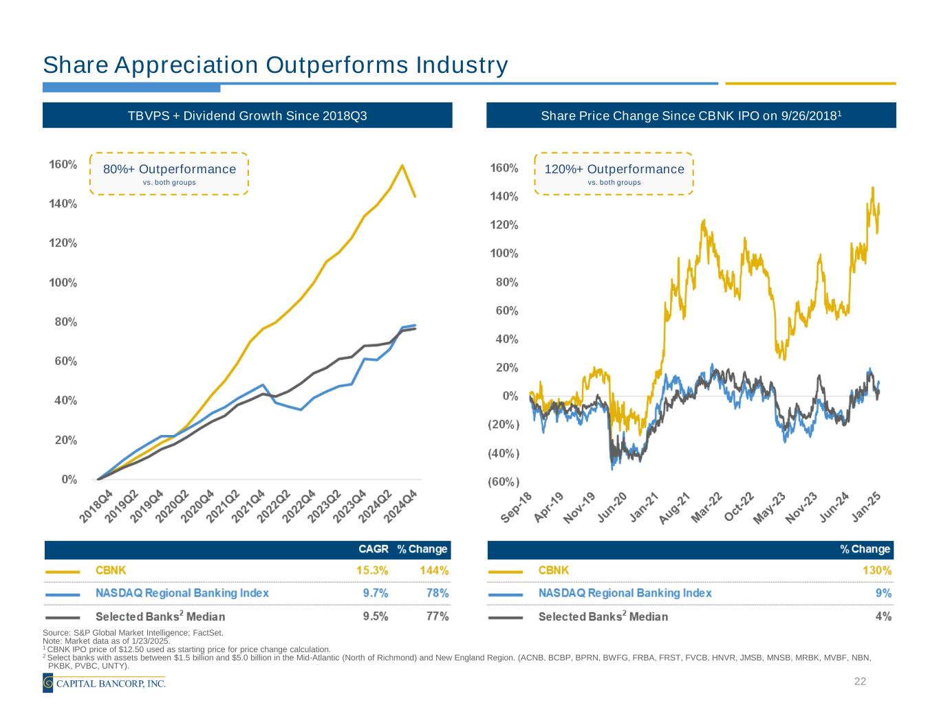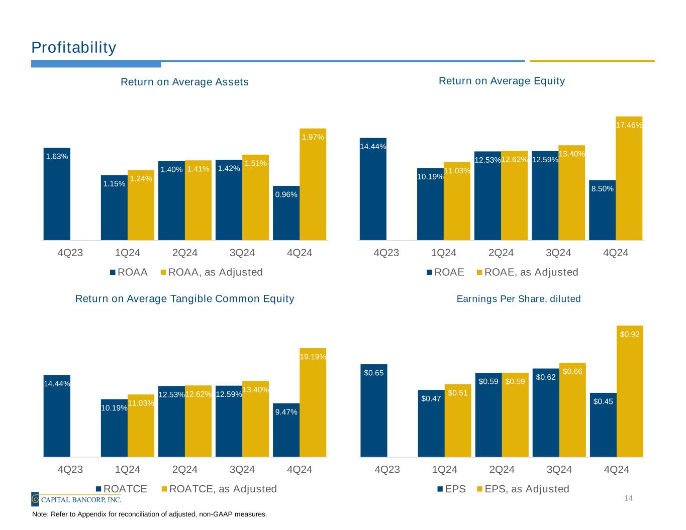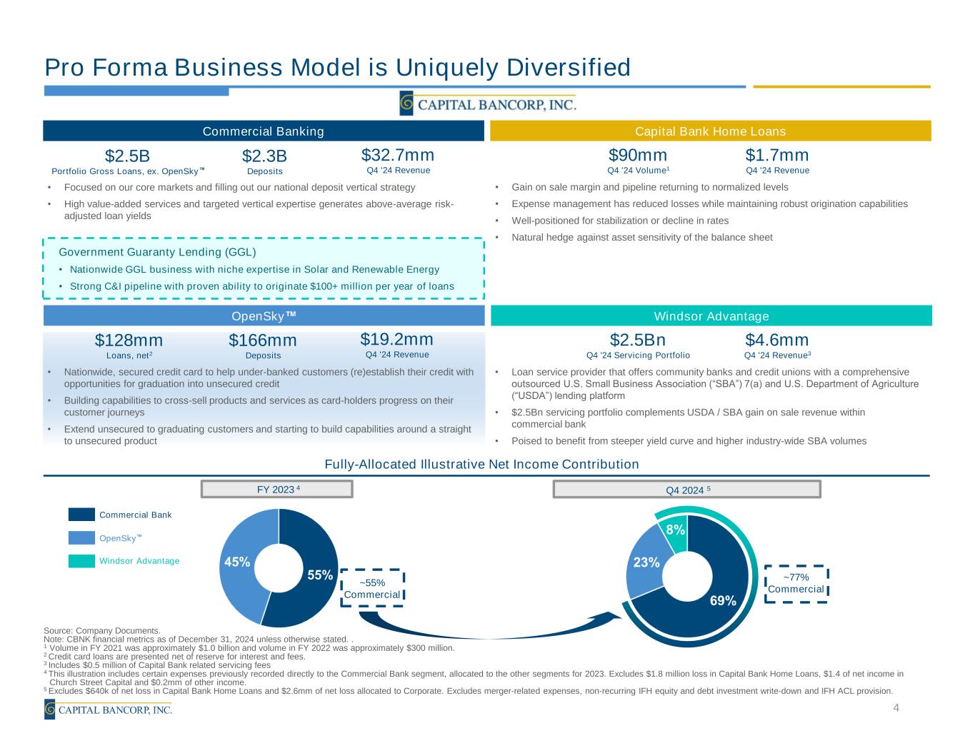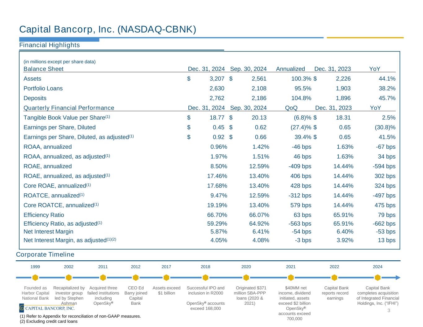 (in millions except per share data) Balance Sheet Dec. 31, 2024 Sep. 30, 2024 Annualized Dec. 31, 2023 YoY Assets $ 3,207 $ 2,561 100.3% $ 2,226 44.1% Portfolio Loans 2,630 2,108 95.5% 1,903 38.2% Deposits 2,762 2,186 104.8% 1,896 45.7% Quarterly Financial Performance Dec. 31, 2024 Sep. 30, 2024 QoQ Dec. 31, 2023 YoY Tangible Book Value per Share(1) $ 18.77 $ 20.13 (6.8)% $ 18.31 2.5% Earnings per Share, Diluted $ 0.45 $ 0.62 (27.4)% $ 0.65 (30.8)% Earnings per Share, Diluted, as adjusted(1) $ 0.92 $ 0.66 39.4% $ 0.65 41.5% ROAA, annualized 0.96% 1.42% -46 bps 1.63% -67 bps ROAA, annualized, as adjusted(1) 1.97% 1.51% 46 bps 1.63% 34 bps ROAE, annualized 8.50% 12.59% -409 bps 14.44% -594 bps ROAE, annualized, as adjusted(1) 17.46% 13.40% 406 bps 14.44% 302 bps Core ROAE, annualized(1) 17.68% 13.40% 428 bps 14.44% 324 bps ROATCE, annualized(1) 9.47% 12.59% -312 bps 14.44% -497 bps Core ROATCE, annualized(1) 19.19% 13.40% 579 bps 14.44% 475 bps Efficiency Ratio 66.70% 66.07% 63 bps 65.91% 79 bps Efficiency Ratio, as adjusted(1) 59.29% 64.92% -563 bps 65.91% -662 bps Net Interest Margin 5.87% 6.41% -54 bps 6.40% -53 bps Net Interest Margin, as adjusted(1)(2) 4.05% 4.08% -3 bps 3.92% 13 bps Capital Bancorp, Inc. (NASDAQ-CBNK) Financial Highlights Corporate Timeline Founded as Harbor Capital National Bank Recapitalized by investor group led by Stephen Ashman Acquired three failed institutions including OpenSky® CEO Ed Barry joined Capital Bank Assets exceed $1 billion Successful IPO and inclusion in R2000 OpenSky® accounts exceed 168,000 1999 2002 2011 2012 2017 2018 Originated $371 million SBA-PPP loans (2020 & 2021) 2020 $40MM net income, dividend initiated, assets exceed $2 billion OpenSky® accounts exceed 700,000 2021 Capital Bank reports record earnings 2022 (1) Refer to Appendix for reconciliation of non-GAAP measures. (2) Excluding credit card loans Capital Bank completes acquisition of Integrated Financial Holdings, Inc. (“IFHI”) 2024 3
