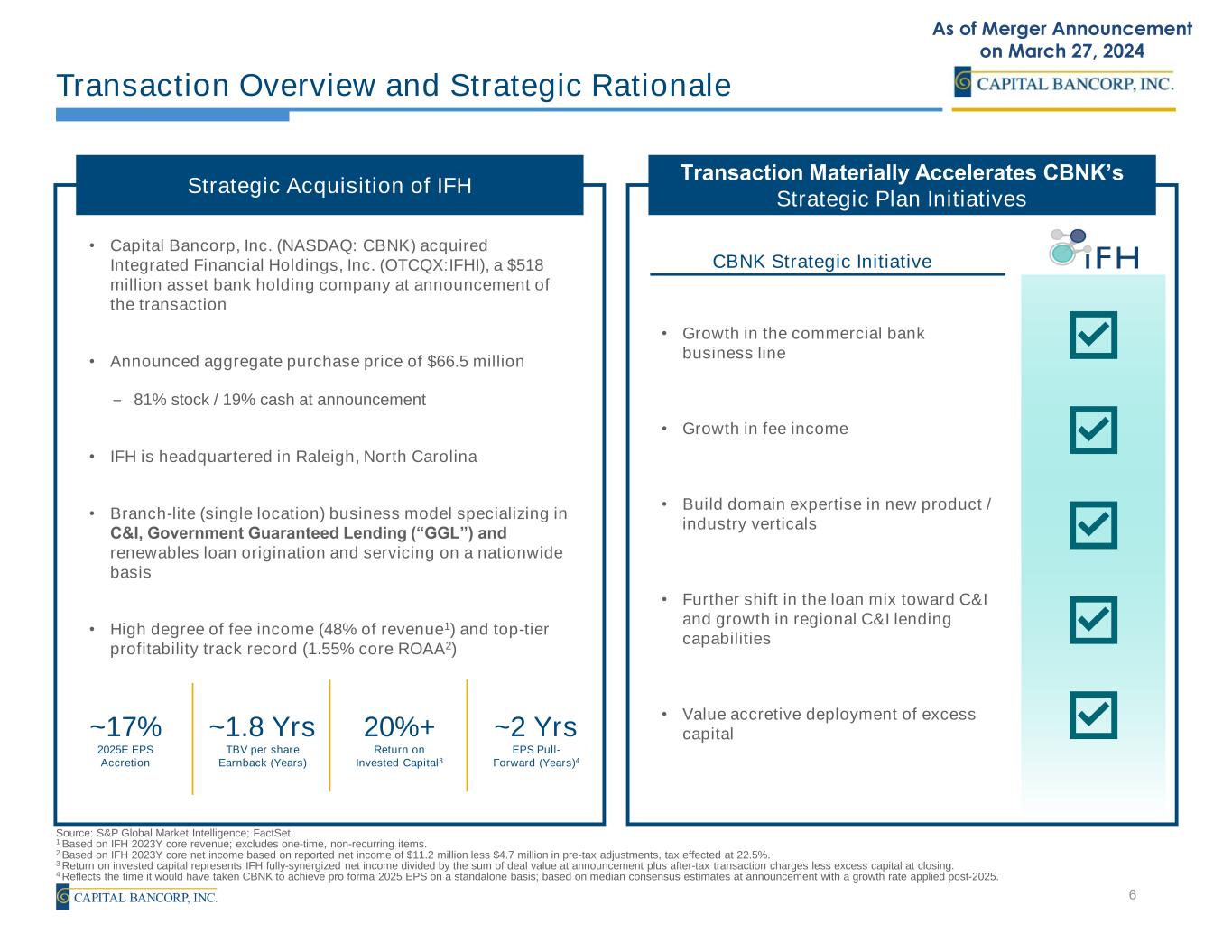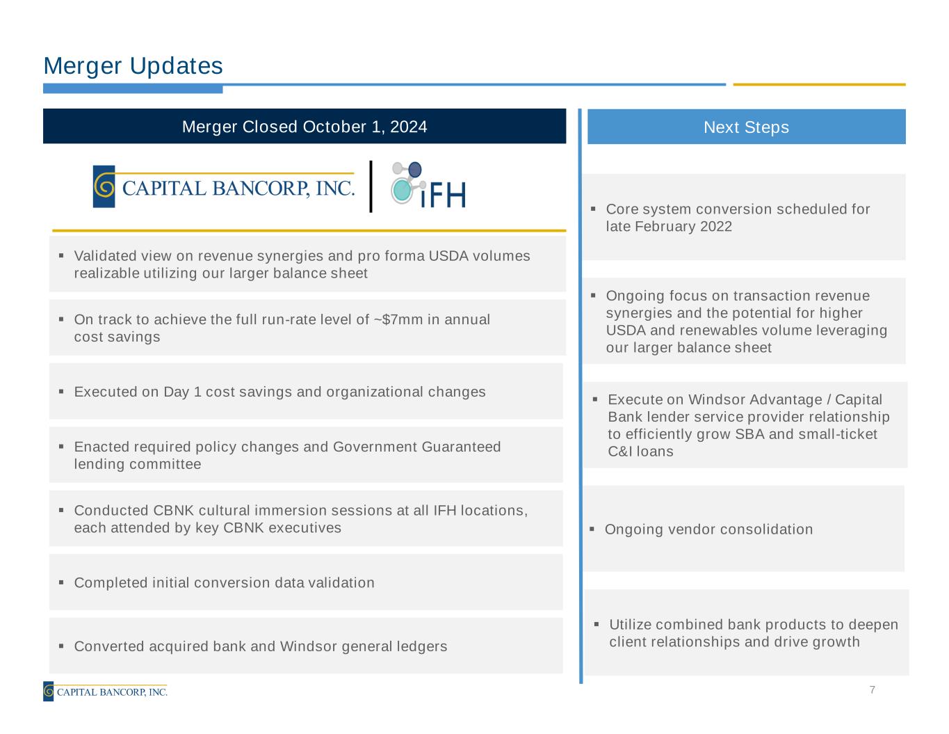 Source: S&P Global Market Intelligence; FactSet. 1 Based on IFH 2023Y core revenue; excludes one-time, non-recurring items. 2 Based on IFH 2023Y core net income based on reported net income of $11.2 million less $4.7 million in pre-tax adjustments, tax effected at 22.5%. 3 Return on invested capital represents IFH fully-synergized net income divided by the sum of deal value at announcement plus after-tax transaction charges less excess capital at closing. 4 Reflects the time it would have taken CBNK to achieve pro forma 2025 EPS on a standalone basis; based on median consensus estimates at announcement with a growth rate applied post-2025. Transaction Overview and Strategic Rationale Strategic Acquisition of IFH Transaction Materially Accelerates CBNK’s Strategic Plan Initiatives • Capital Bancorp, Inc. (NASDAQ: CBNK) acquired Integrated Financial Holdings, Inc. (OTCQX:IFHI), a $518 million asset bank holding company at announcement of the transaction • Announced aggregate purchase price of $66.5 million ‒ 81% stock / 19% cash at announcement • IFH is headquartered in Raleigh, North Carolina • Branch-lite (single location) business model specializing in C&I, Government Guaranteed Lending (“GGL”) and renewables loan origination and servicing on a nationwide basis • High degree of fee income (48% of revenue1) and top-tier profitability track record (1.55% core ROAA2) CBNK Strategic Initiative ~17% 2025E EPS Accretion ~1.8 Yrs TBV per share Earnback (Years) 20%+ Return on Invested Capital3 ~2 Yrs EPS Pull- Forward (Years)4 • Growth in the commercial bank business line • Growth in fee income • Build domain expertise in new product / industry verticals • Further shift in the loan mix toward C&I and growth in regional C&I lending capabilities • Value accretive deployment of excess capital 6 As of Merger Announcement on March 27, 2024