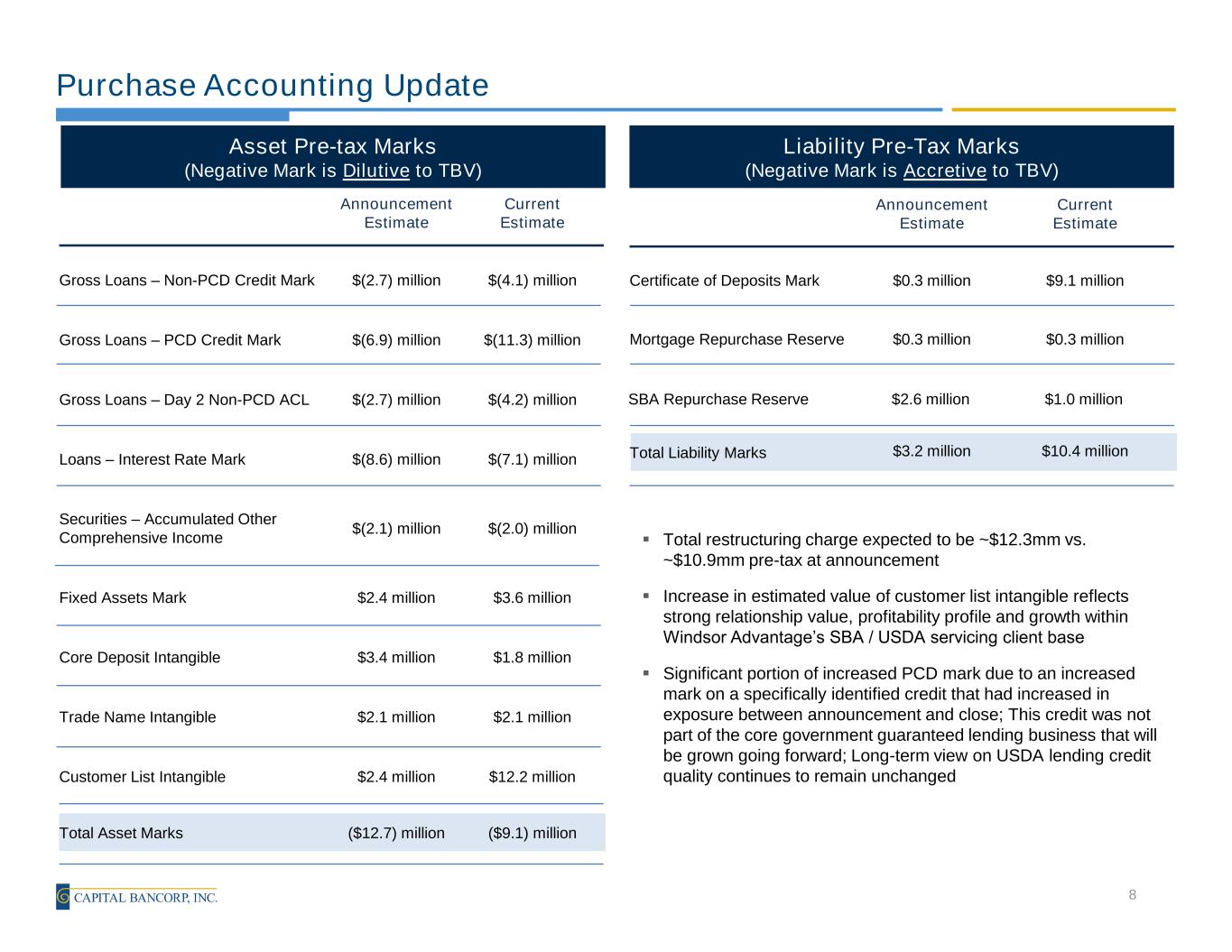 Merger Updates 7 Merger Closed October 1, 2024 ▪ On track to achieve the full run-rate level of ~$7mm in annual cost savings ▪ Executed on Day 1 cost savings and organizational changes ▪ Enacted required policy changes and Government Guaranteed lending committee ▪ Conducted CBNK cultural immersion sessions at all IFH locations, each attended by key CBNK executives ▪ Completed initial conversion data validation ▪ Validated view on revenue synergies and pro forma USDA volumes realizable utilizing our larger balance sheet ▪ Converted acquired bank and Windsor general ledgers Next Steps ▪ Core system conversion scheduled for late February 2022 ▪ Ongoing focus on transaction revenue synergies and the potential for higher USDA and renewables volume leveraging our larger balance sheet ▪ Ongoing vendor consolidation ▪ Execute on Windsor Advantage / Capital Bank lender service provider relationship to efficiently grow SBA and small-ticket C&I loans ▪ Utilize combined bank products to deepen client relationships and drive growth