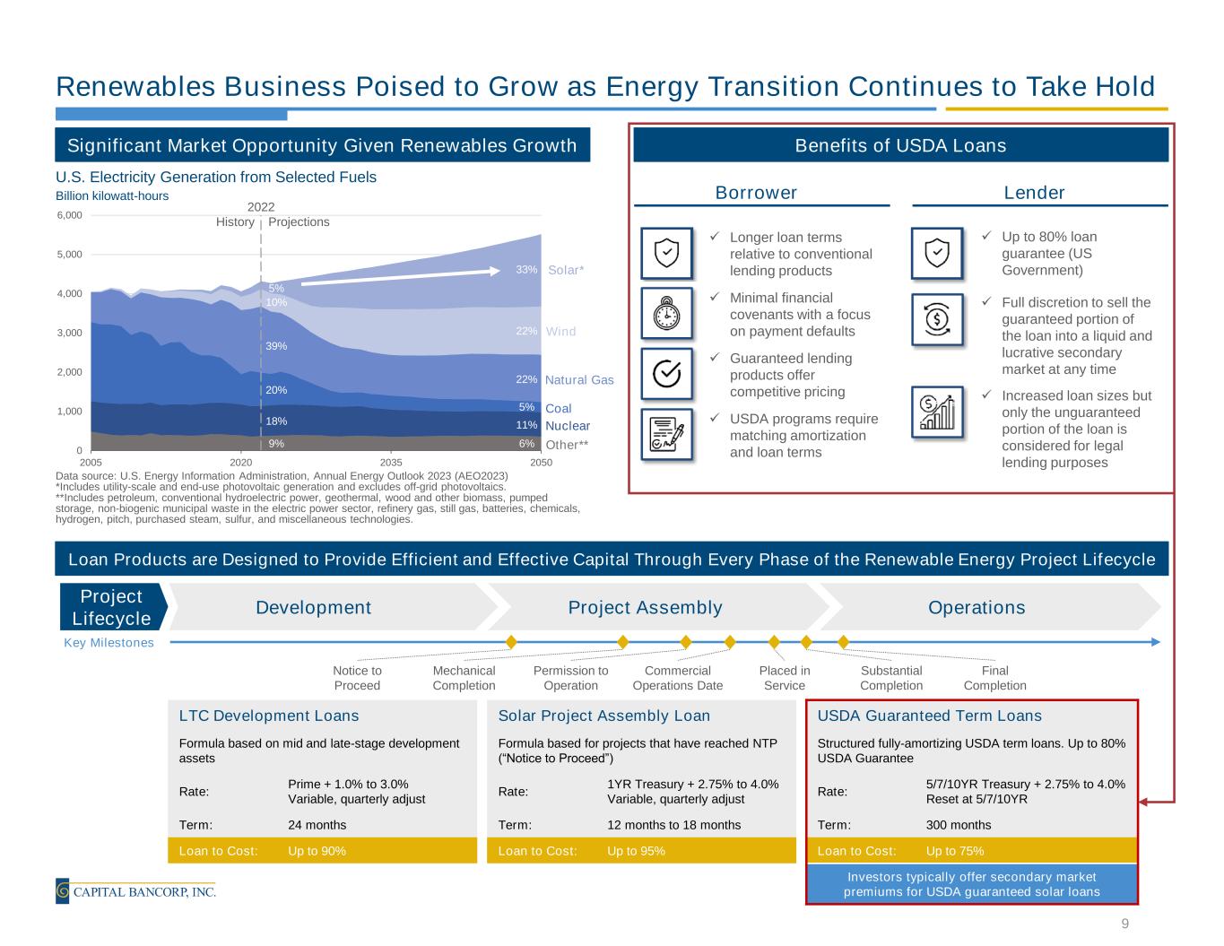 Renewables Business Poised to Grow as Energy Transition Continues to Take Hold OperationsProject AssemblyDevelopment Project Lifecycle LTC Development Loans Formula based on mid and late-stage development assets Rate: Prime + 1.0% to 3.0% Variable, quarterly adjust Term: 24 months Loan to Cost: Up to 90% Solar Project Assembly Loan Formula based for projects that have reached NTP (“Notice to Proceed”) Rate: 1YR Treasury + 2.75% to 4.0% Variable, quarterly adjust Term: 12 months to 18 months Loan to Cost: Up to 95% USDA Guaranteed Term Loans Structured fully-amortizing USDA term loans. Up to 80% USDA Guarantee Rate: 5/7/10YR Treasury + 2.75% to 4.0% Reset at 5/7/10YR Term: 300 months Loan to Cost: Up to 75% Investors typically offer secondary market premiums for USDA guaranteed solar loans ✓ Longer loan terms relative to conventional lending products ✓ Minimal financial covenants with a focus on payment defaults ✓ Guaranteed lending products offer competitive pricing ✓ USDA programs require matching amortization and loan terms ✓ Up to 80% loan guarantee (US Government) ✓ Full discretion to sell the guaranteed portion of the loan into a liquid and lucrative secondary market at any time ✓ Increased loan sizes but only the unguaranteed portion of the loan is considered for legal lending purposes Borrower Lender Key Milestones Mechanical Completion Permission to Operation Commercial Operations Date Placed in Service Substantial Completion Final Completion Notice to Proceed U.S. Electricity Generation from Selected Fuels Billion kilowatt-hours 0 1,000 2,000 3,000 4,000 5,000 6,000 2005 2020 2035 2050 2022 History Projections Solar* Data source: U.S. Energy Information Administration, Annual Energy Outlook 2023 (AEO2023) *Includes utility-scale and end-use photovoltaic generation and excludes off-grid photovoltaics. **Includes petroleum, conventional hydroelectric power, geothermal, wood and other biomass, pumped storage, non-biogenic municipal waste in the electric power sector, refinery gas, still gas, batteries, chemicals, hydrogen, pitch, purchased steam, sulfur, and miscellaneous technologies. Wind Natural Gas Coal Nuclear Other**9% 18% 20% 39% 10% 5% 6% 11% 5% 22% 22% 33% Significant Market Opportunity Given Renewables Growth Benefits of USDA Loans Loan Products are Designed to Provide Efficient and Effective Capital Through Every Phase of the Renewable Energy Project Lifecycle 9