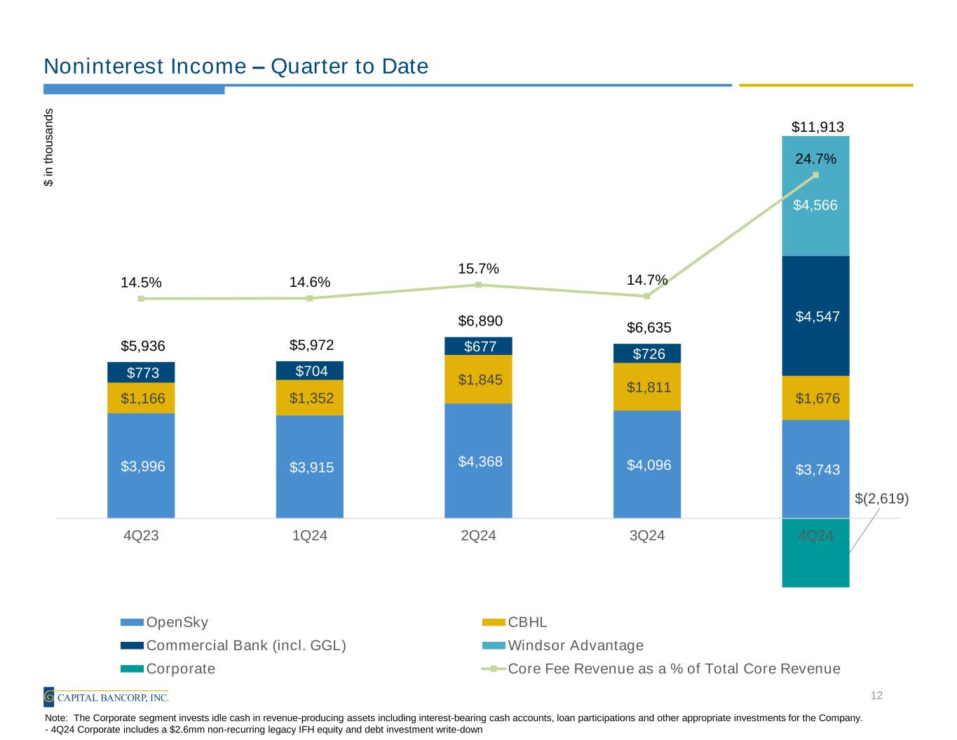 Net Interest Income and Net Interest Margin $19,073 $19,375 $20,623 $21,821 $27,394 $15,035 $14,921 $15,785 $15,625 $15,454 $715 $34,889 $35,008 $37,057 $38,354 $44,327 6.40% 6.24% 6.46% 6.41% 5.87% 3.92% 3.85% 4.00% 4.08% 4.05% 4Q23 1Q24 2Q24 3Q24 4Q24 Commercial Bank Other OpenSky Net Purchase Accounting Accretion Net Interest Margin Net Interest Margin, as Adjusted(1) $ i n t h o u s a n d s 11 (1) Refer to Appendix for reconciliation of non-GAAP measures. Note: Other includes CBHL and Corporate