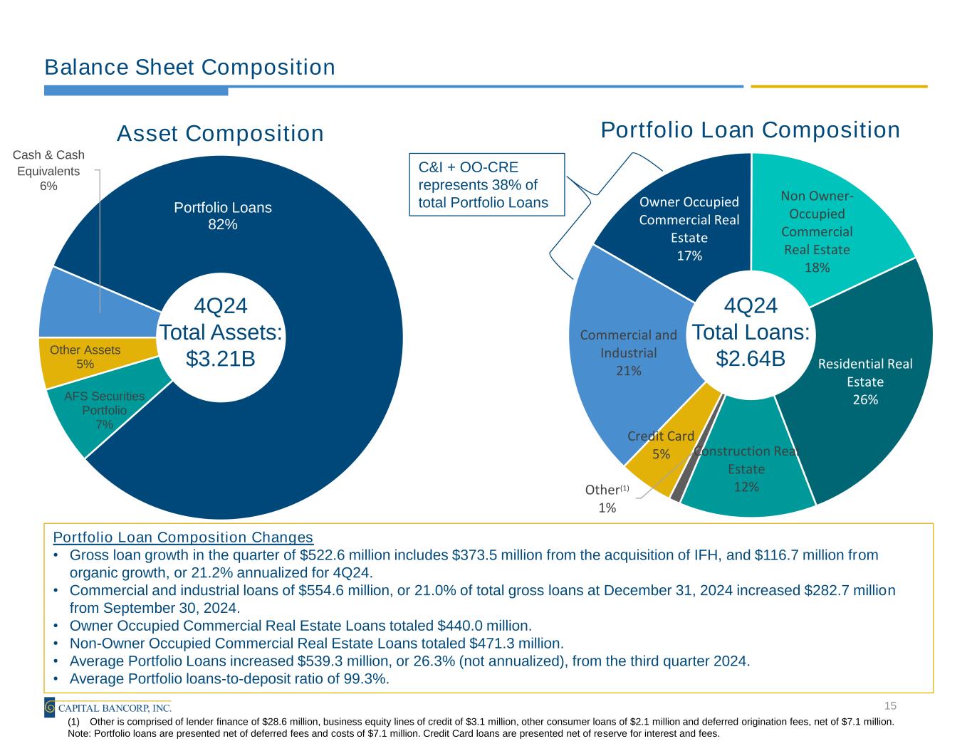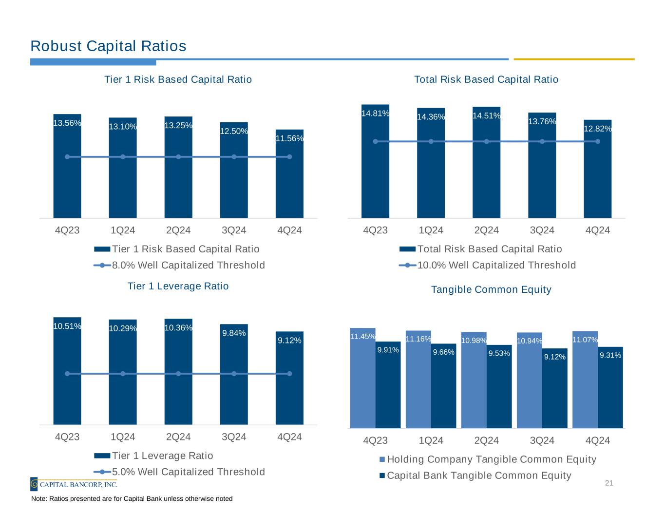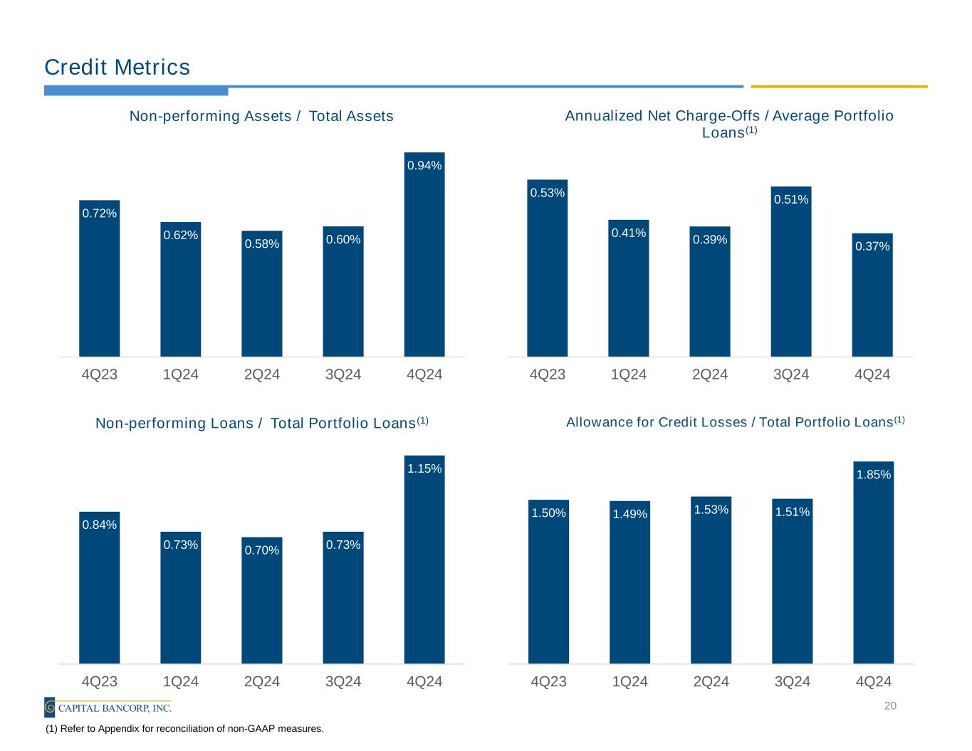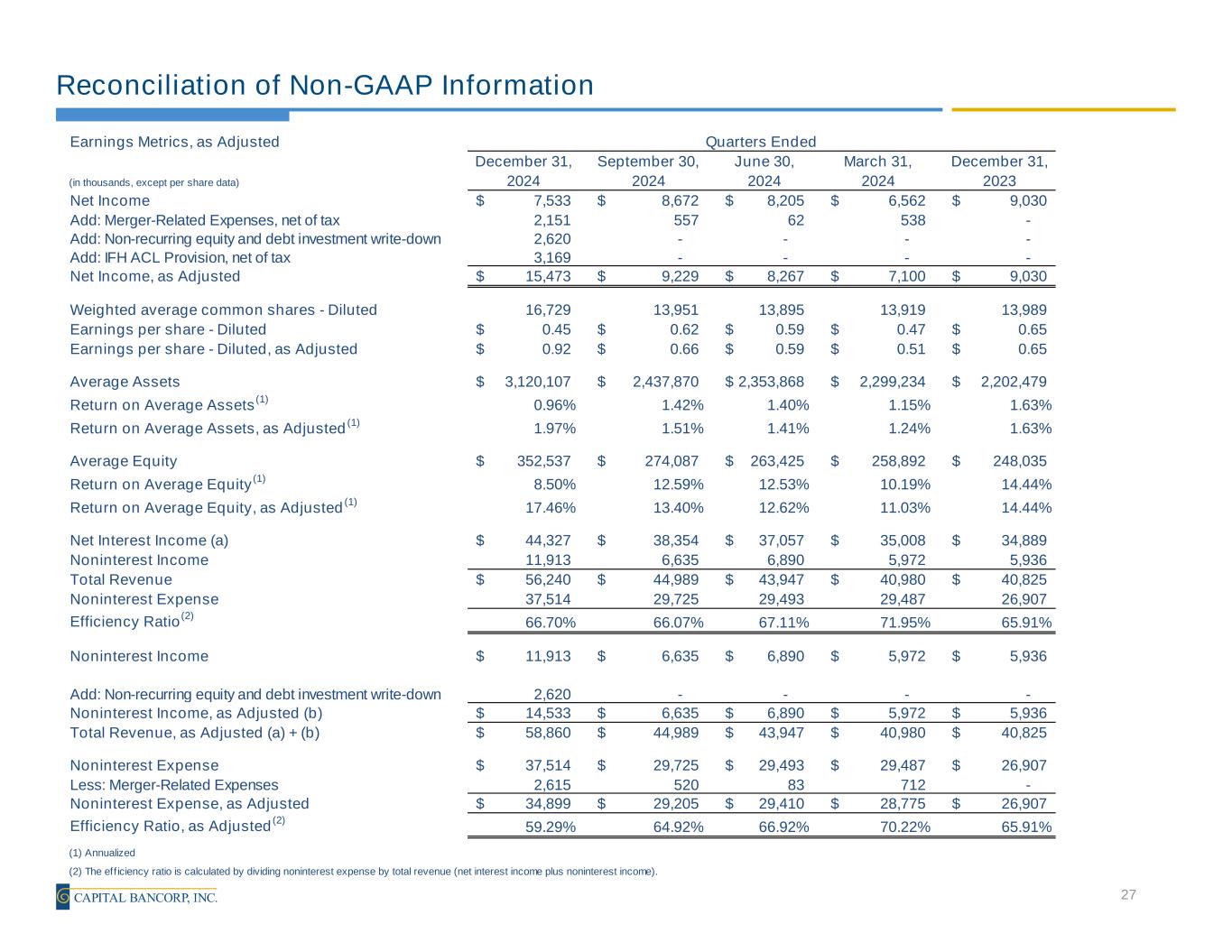 •The ratio of allowance for credit losses to total loans equaled 1.85% at December 31, 2024 including 1.44% for the legacy Capital Bank portfolio, down 7 basis points from 3Q. The additional ACL coverage results from the initial $15.5 million impact from the acquisition of the IFH portfolio.
