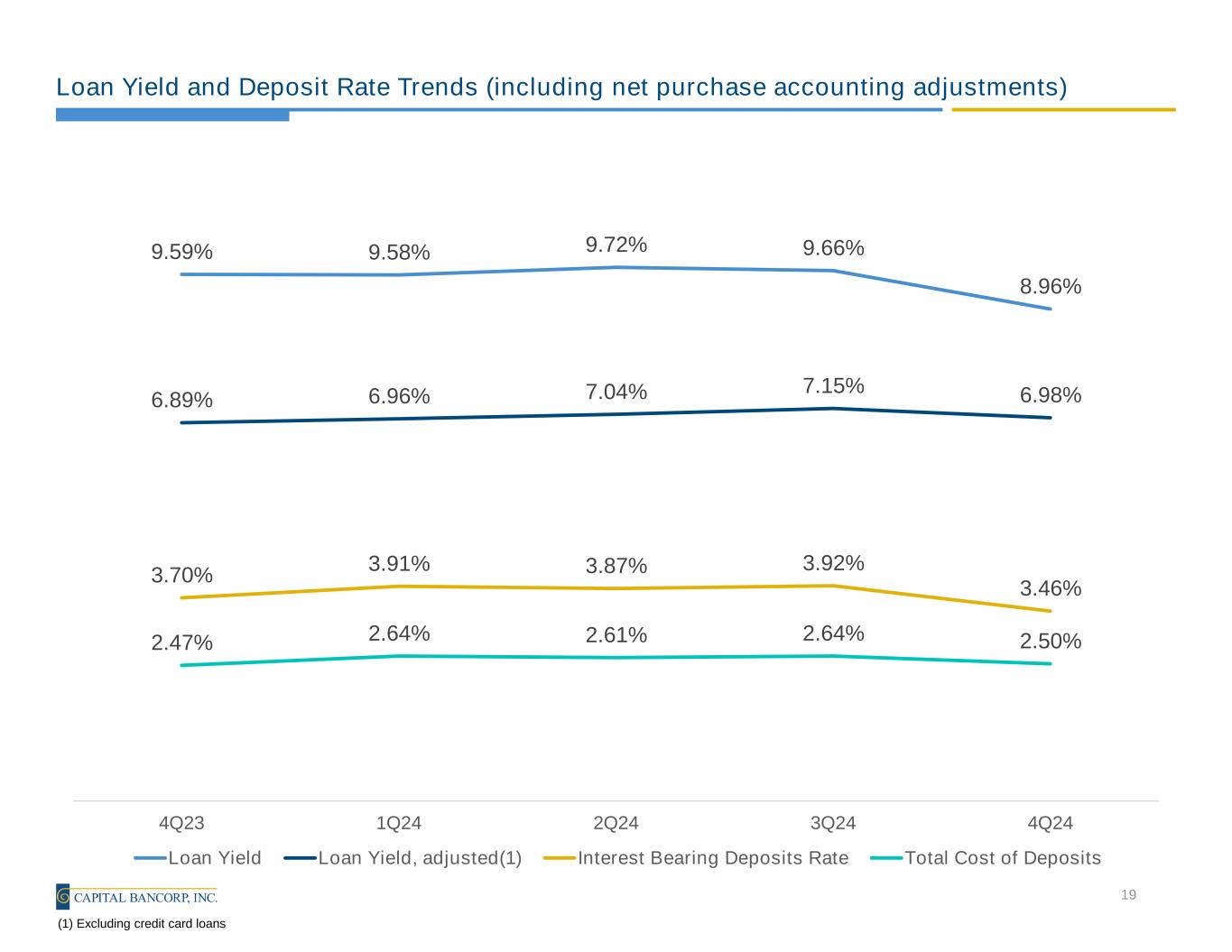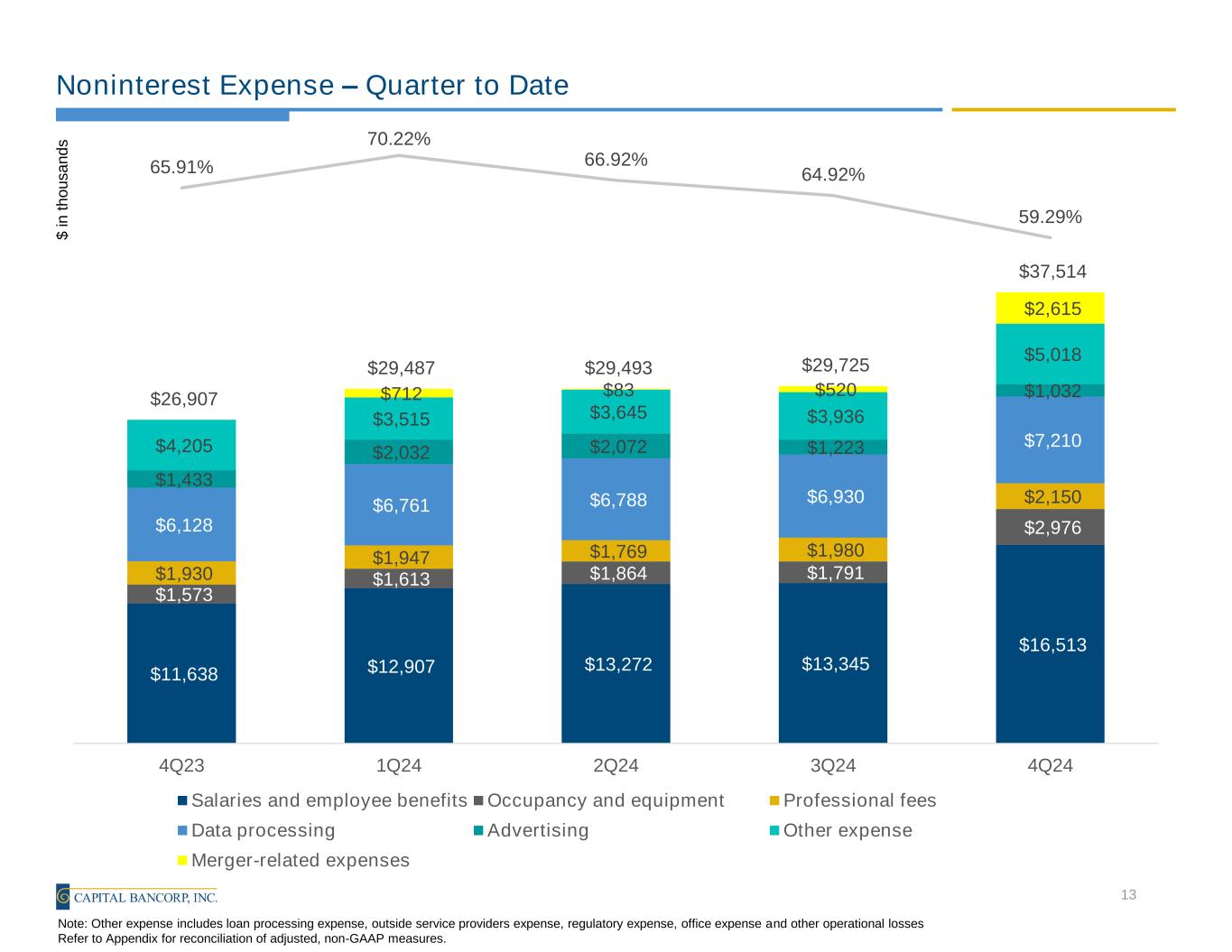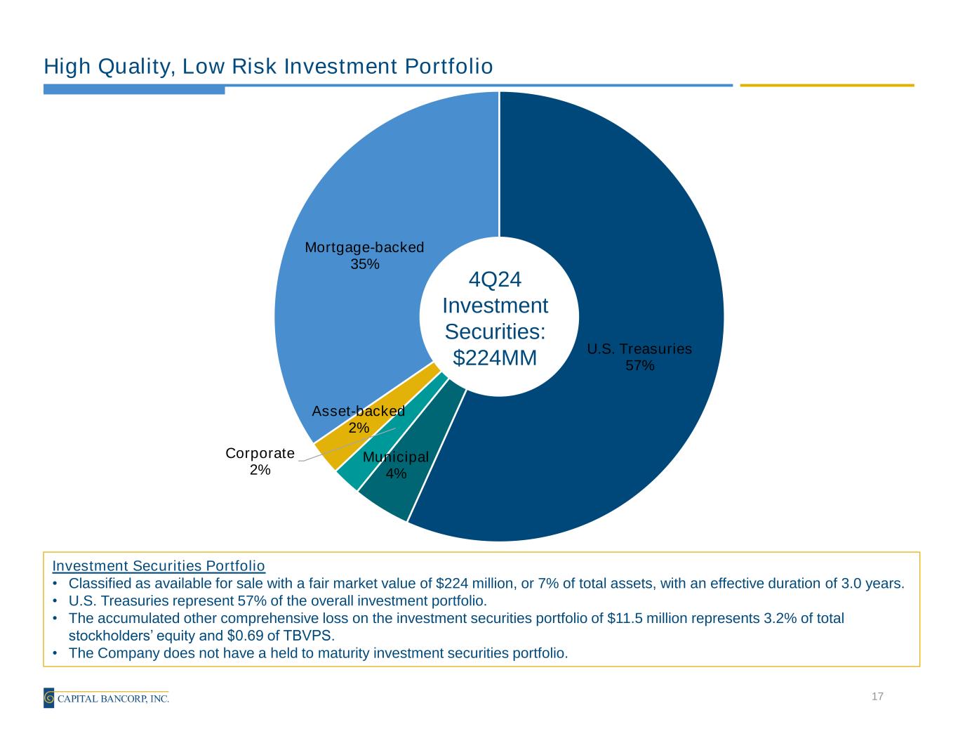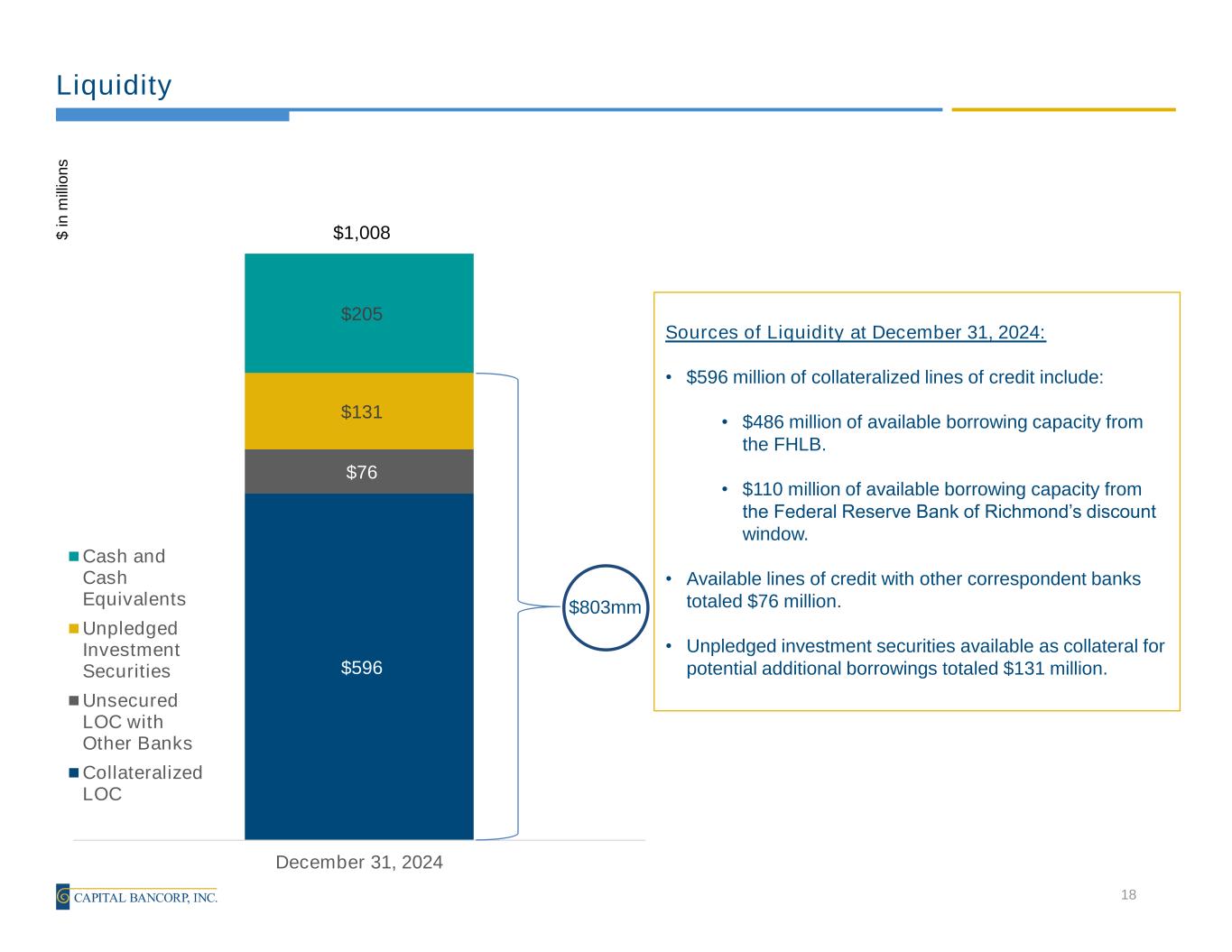•The ratio of allowance for credit losses to total loans equaled 1.85% at December 31, 2024 including 1.44% for the legacy Capital Bank portfolio, down 7 basis points from 3Q. The additional ACL coverage results from the initial $15.5 million impact from the acquisition of the IFH portfolio.
