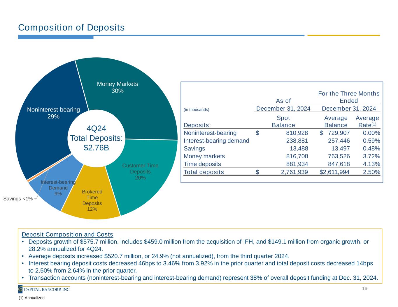 •Total Deposit Growth in the quarter of $575.7 million includes $459.0 million from the acquisition of IFH, and $116.7 million from organic growth, or 21.2% annualized for 4Q 2024