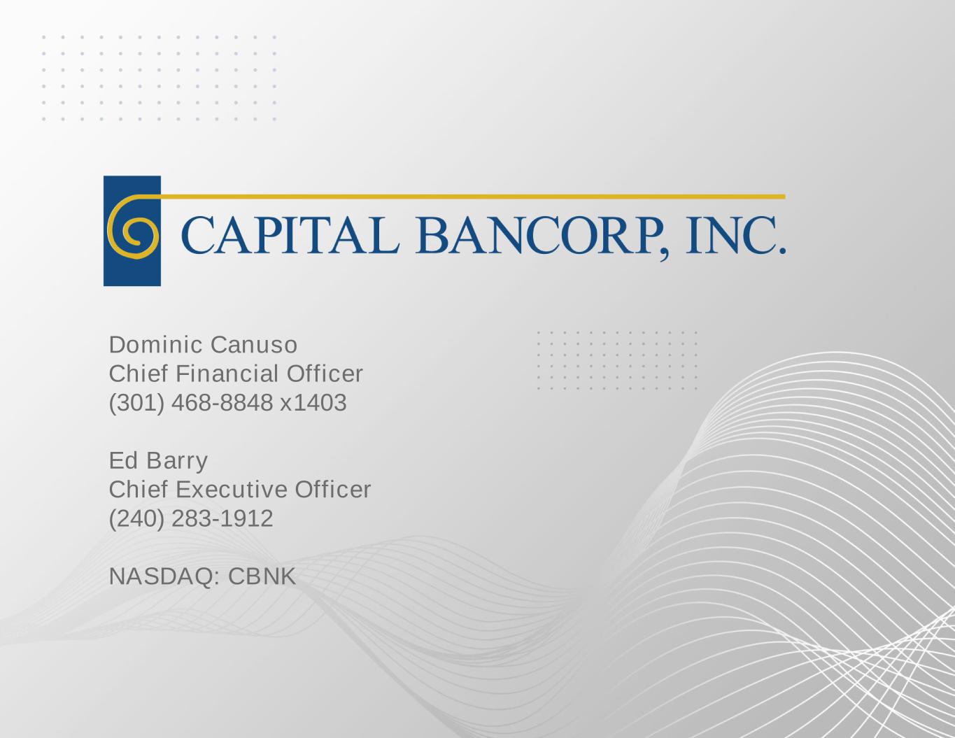 Capital Bancorp, Inc., Rockville, Maryland is a registered bank holding company incorporated under the laws of Maryland. Capital Bancorp has been providing financial services since 1999 and now operates bank branches in six locations in the greater Washington, D.C. and Baltimore, Maryland markets, one bank branch in Fort Lauderdale, Florida and one bank branch in Chicago, Illinois. Capital Bancorp had assets of approximately $3.2 billion at December 31, 2024 and its common stock is traded in the NASDAQ Global Market under the symbol “CBNK.” More information can be found at the Company's website www.CapitalBankMD.com under its investor relations page.