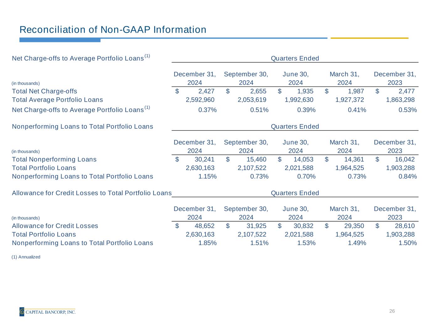 Net Charge-offs to Average Portfolio Loans (1) (in thousands) December 31, 2024 September 30, 2024 June 30, 2024 March 31, 2024 December 31, 2023 Total Net Charge-offs 2,427$ 2,655$ 1,935$ 1,987$ 2,477$ Total Average Portfolio Loans 2,592,960 2,053,619 1,992,630 1,927,372 1,863,298 Net Charge-offs to Average Portfolio Loans (1) 0.37% 0.51% 0.39% 0.41% 0.53% Nonperforming Loans to Total Portfolio Loans (in thousands) December 31, 2024 September 30, 2024 June 30, 2024 March 31, 2024 December 31, 2023 Total Nonperforming Loans 30,241$ 15,460$ 14,053$ 14,361$ 16,042$ Total Portfolio Loans 2,630,163 2,107,522 2,021,588 1,964,525 1,903,288 Nonperforming Loans to Total Portfolio Loans 1.15% 0.73% 0.70% 0.73% 0.84% Allowance for Credit Losses to Total Portfolio Loans (in thousands) December 31, 2024 September 30, 2024 June 30, 2024 March 31, 2024 December 31, 2023 Allowance for Credit Losses 48,652$ 31,925$ 30,832$ 29,350$ 28,610$ Total Portfolio Loans 2,630,163 2,107,522 2,021,588 1,964,525 1,903,288 Nonperforming Loans to Total Portfolio Loans 1.85% 1.51% 1.53% 1.49% 1.50% (1) Annualized Quarters Ended Quarters Ended Quarters Ended Reconciliation of Non-GAAP Information 26