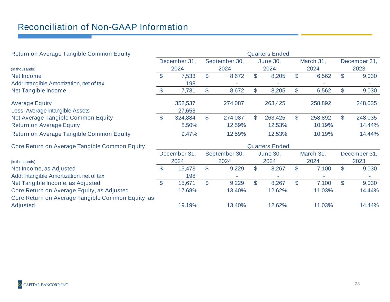 Reconciliation of Non-GAAP Information 27 Earnings Metrics, as Adjusted (in thousands, except per share data) December 31, 2024 September 30, 2024 June 30, 2024 March 31, 2024 December 31, 2023 Net Income 7,533$ 8,672$ 8,205$ 6,562$ 9,030$ Add: Merger-Related Expenses, net of tax 2,151 557 62 538 - Add: Non-recurring equity and debt investment write-down 2,620 - - - - Add: IFH ACL Provision, net of tax 3,169 - - - - Net Income, as Adjusted 15,473$ 9,229$ 8,267$ 7,100$ 9,030$ Weighted average common shares - Diluted 16,729 13,951 13,895 13,919 13,989 Earnings per share - Diluted 0.45$ 0.62$ 0.59$ 0.47$ 0.65$ Earnings per share - Diluted, as Adjusted 0.92$ 0.66$ 0.59$ 0.51$ 0.65$ Average Assets 3,120,107$ 2,437,870$ 2,353,868$ 2,299,234$ 2,202,479$ Return on Average Assets (1) 0.96% 1.42% 1.40% 1.15% 1.63% Return on Average Assets, as Adjusted (1) 1.97% 1.51% 1.41% 1.24% 1.63% Average Equity 352,537$ 274,087$ 263,425$ 258,892$ 248,035$ Return on Average Equity (1) 8.50% 12.59% 12.53% 10.19% 14.44% Return on Average Equity, as Adjusted (1) 17.46% 13.40% 12.62% 11.03% 14.44% Net Interest Income (a) 44,327$ 38,354$ 37,057$ 35,008$ 34,889$ Noninterest Income 11,913 6,635 6,890 5,972 5,936 Total Revenue 56,240$ 44,989$ 43,947$ 40,980$ 40,825$ Noninterest Expense 37,514 29,725 29,493 29,487 26,907 Efficiency Ratio (2) 66.70% 66.07% 67.11% 71.95% 65.91% Noninterest Income 11,913$ 6,635$ 6,890$ 5,972$ 5,936$ Add: Non-recurring equity and debt investment write-down 2,620 - - - - Noninterest Income, as Adjusted (b) 14,533$ 6,635$ 6,890$ 5,972$ 5,936$ Total Revenue, as Adjusted (a) + (b) 58,860$ 44,989$ 43,947$ 40,980$ 40,825$ Noninterest Expense 37,514$ 29,725$ 29,493$ 29,487$ 26,907$ Less: Merger-Related Expenses 2,615 520 83 712 - Noninterest Expense, as Adjusted 34,899$ 29,205$ 29,410$ 28,775$ 26,907$ Efficiency Ratio, as Adjusted (2) 59.29% 64.92% 66.92% 70.22% 65.91% (1) Annualized (2) The eff iciency ratio is calculated by dividing noninterest expense by total revenue (net interest income plus noninterest income). Quarters Ended