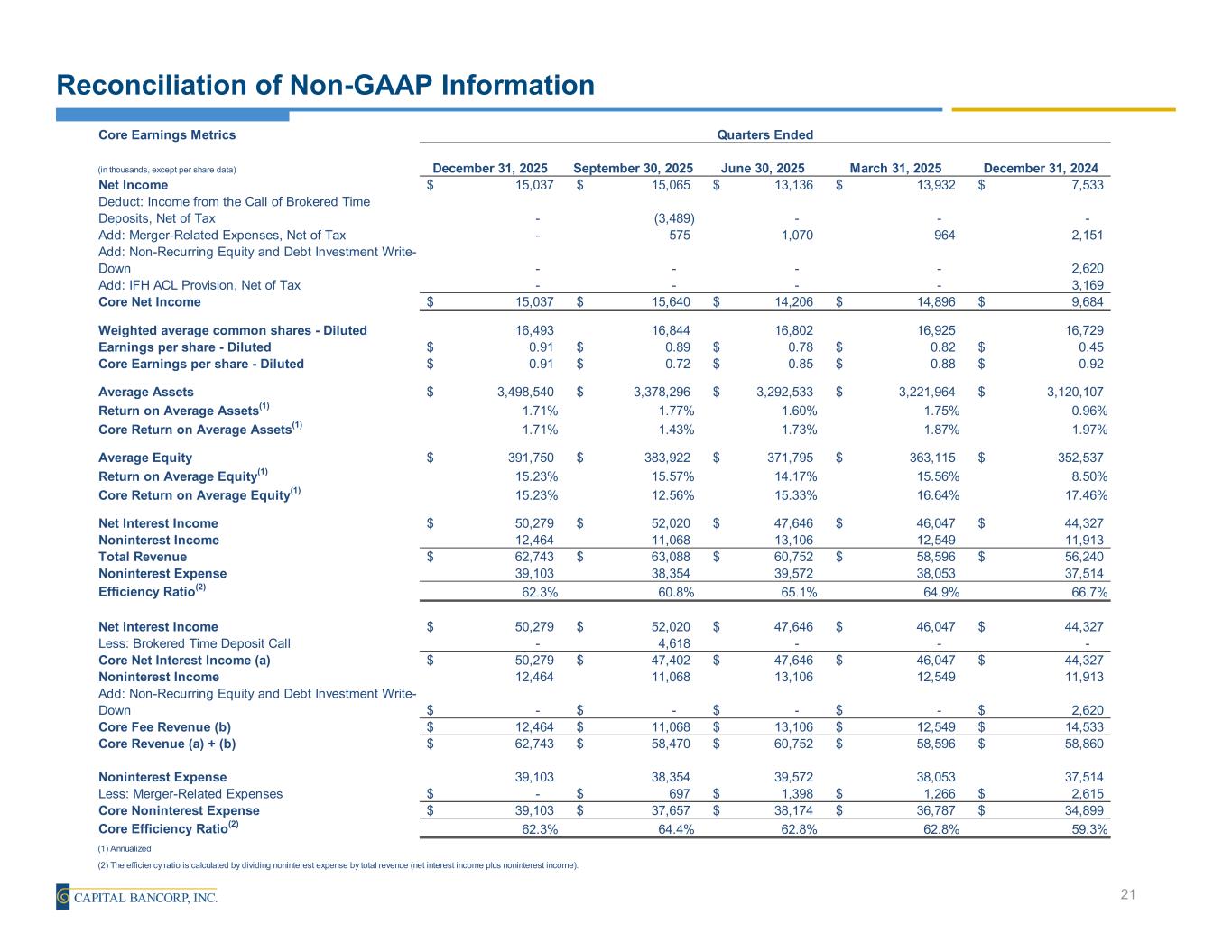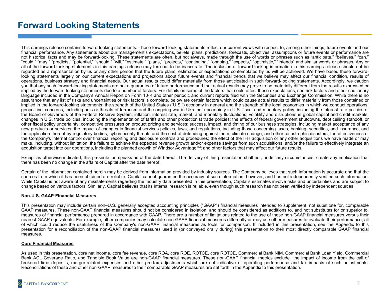 Forward Looking Statements This earnings release contains forward-looking statements. These forward-looking statements reflect our current views with respect to, among other things, future events and our financial performance. Any statements about our management’s expectations, beliefs, plans, predictions, forecasts, objectives, assumptions or future events or performance are not historical facts and may be forward-looking. These statements are often, but not always, made through the use of words or phrases such as “anticipate,” “believes,” “can,” “could,” “may,” “predicts,” “potential,” “should,” “will,” “estimate,” “plans,” “projects,” “continuing,” “ongoing,” “expects,” "optimistic," “intends” and similar words or phrases. Any or all of the forward-looking statements in this earnings release may turn out to be inaccurate. The inclusion of forward-looking information in this earnings release should not be regarded as a representation by us or any other person that the future plans, estimates or expectations contemplated by us will be achieved. We have based these forward- looking statements largely on our current expectations and projections about future events and financial trends that we believe may affect our financial condition, results of operations, business strategy and financial needs. Our actual results could differ materially from those anticipated in such forward-looking statements. Accordingly, we caution you that any such forward-looking statements are not a guarantee of future performance and that actual results may prove to be materially different from the results expressed or implied by the forward-looking statements due to a number of factors. For details on some of the factors that could affect these expectations, see risk factors and other cautionary language included in the Company's Annual Report on Form 10-K and other periodic and current reports filed with the Securities and Exchange Commission. While there is no assurance that any list of risks and uncertainties or risk factors is complete, below are certain factors which could cause actual results to differ materially from those contained or implied in the forward-looking statements: the strength of the United States (“U.S.”) economy in general and the strength of the local economies in which we conduct operations; geopolitical concerns, including acts or threats of terrorism and the ongoing war in Ukraine; uncertainty in U.S. fiscal and monetary policy, including the interest rate policies of the Board of Governors of the Federal Reserve System; inflation, interest rate, market, and monetary fluctuations; volatility and disruptions in global capital and credit markets; changes in U.S. trade policies, including the implementation of tariffs and other protectionist trade policies; the effects of federal government shutdowns, debt ceiling standoff, or other fiscal policy uncertainty; competitive pressures on product pricing and services; success, impact, and timing of our business strategies, including market acceptance of any new products or services; the impact of changes in financial services policies, laws, and regulations, including those concerning taxes, banking, securities, and insurance, and the application thereof by regulatory bodies; cybersecurity threats and the cost of defending against them; climate change, and other catastrophic disasters; the effectiveness of the Company's internal control over financial reporting and disclosure controls and procedures; the effect of the IFH acquisition or any other acquisitions we have made or may make, including, without limitation, the failure to achieve the expected revenue growth and/or expense savings from such acquisitions, and/or the failure to effectively integrate an acquisition target into our operations, including the planned growth of Windsor AdvantageTM; and other factors that may affect our future results. Except as otherwise indicated, this presentation speaks as of the date hereof. The delivery of this presentation shall not, under any circumstances, create any implication that there has been no change in the affairs of Capital after the date hereof. Certain of the information contained herein may be derived from information provided by industry sources. The Company believes that such information is accurate and that the sources from which it has been obtained are reliable. Capital cannot guarantee the accuracy of such information, however, and has not independently verified such information. While Capital is not aware of any misstatements regarding the industry data presented in this presentation, Capital's estimates involve risks and uncertainties and are subject to change based on various factors. Similarly, Capital believes that its internal research is reliable, even though such research has not been verified by independent sources. Non-U.S. GAAP Financial Measures This presentation may include certain non–U.S. generally accepted accounting principles ("GAAP") financial measures intended to supplement, not substitute for, comparable GAAP measures. These non-GAAP financial measures should not be considered in isolation, and should be considered as additions to, and not substitutes for or superior to, measures of financial performance prepared in accordance with GAAP. There are a number of limitations related to the use of these non-GAAP financial measures versus their nearest GAAP equivalents. For example, other companies may calculate non-GAAP financial measures differently or may use other measures to evaluate their performance, all of which could reduce the usefulness of the Company's non-GAAP financial measures as tools for comparison. If included in this presentation, see the Appendix to this presentation for a reconciliation of the non-GAAP financial measures used in (or conveyed orally during) this presentation to their most directly comparable GAAP financial measu