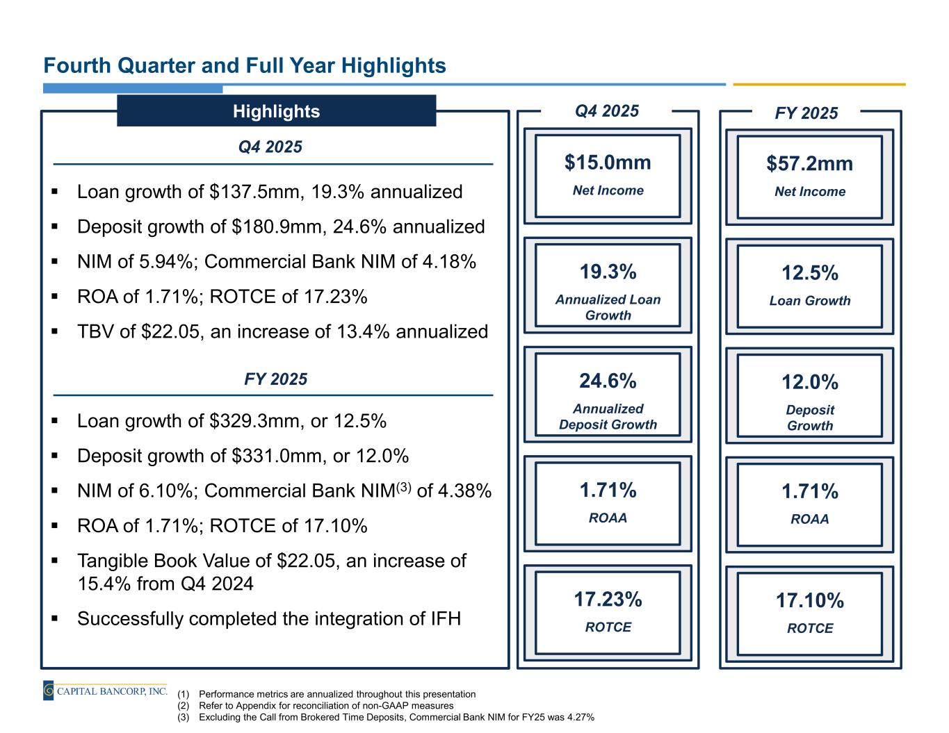 Fourth Quarter and Full Year Highlights (1) Performance metrics are annualized throughout this presentation (2) Refer to Appendix for reconciliation of non-GAAP measures (3) Excluding the Call from Brokered Time Deposits, Commercial Bank NIM for FY25 was 4.27% Loan growth of $137.5mm, 19.3% annualized Deposit growth of $180.9mm, 24.6% annualized NIM of 5.94%; Commercial Bank NIM of 4.18% ROA of 1.71%; ROTCE of 17.23% TBV of $22.05, an increase of 13.4% annualized Highlights Loan growth of $329.3mm, or 12.5% Deposit growth of $331.0mm, or 12.0% NIM of 6.10%; Commercial Bank NIM(3) of 4.38% ROA of 1.71%; ROTCE of 17.10% Tangible Book Value of $22.05, an increase of 15.4% from Q4 2024 Successfully completed the integration of IFH Net Income $15.0mm Annualized Loan Growth 19.3% Annualized Deposit Growth 24.6% ROAA 1.71% ROTCE 17.23% Net Income $57.2mm Loan Growth 12.5% Deposit Growth 12.0% ROAA 1.71% ROTCE 17.10% Q4 2025 Q4 2025 FY 2025 FY 2025