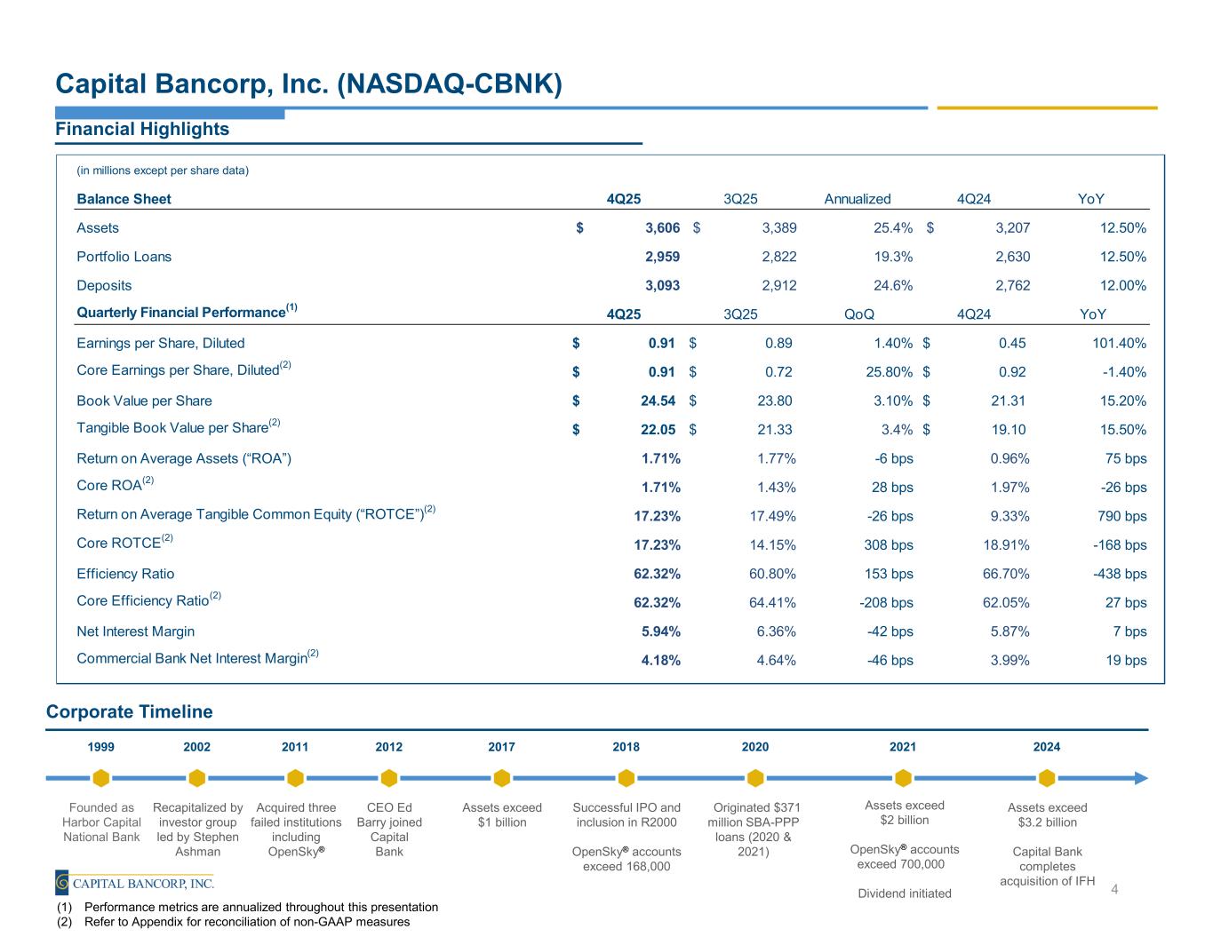 ◦Customer Deposit3 growth of $41.8 million, or 6.2% (annualized) from 3Q 2025, and $287.4 million, or 11.8% from 4Q 2024