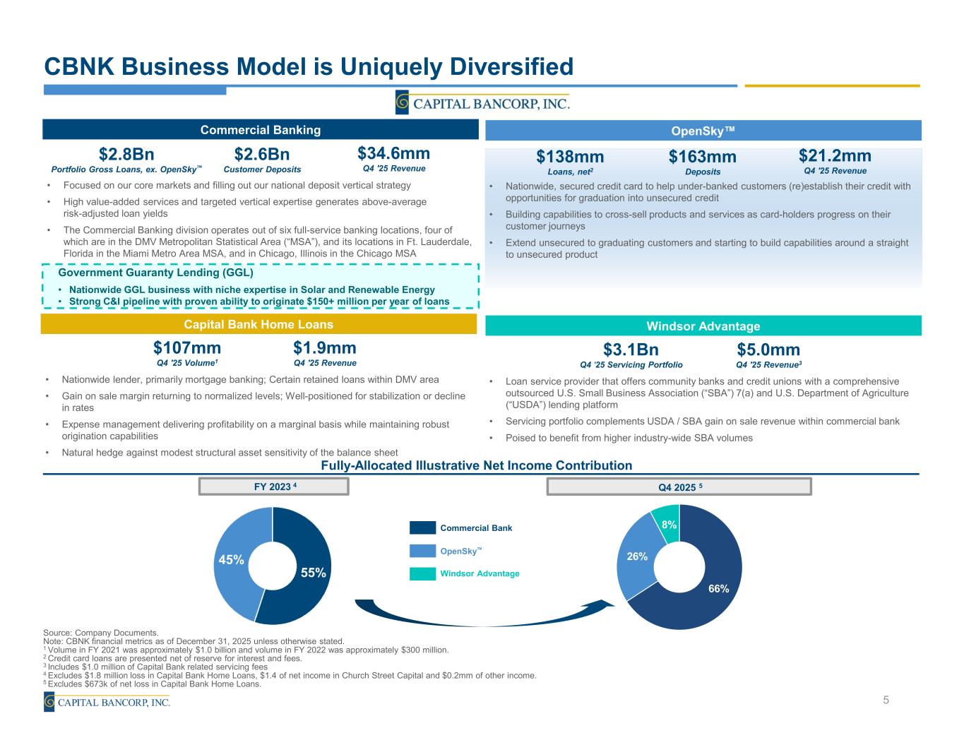 Capital Bancorp, Inc. (NASDAQ-CBNK) Financial Highlights Corporate Timeline Founded as Harbor Capital National Bank Recapitalized by investor group led by Stephen Ashman Acquired three failed institutions including OpenSky® CEO Ed Barry joined Capital Bank Assets exceed $1 billion Successful IPO and inclusion in R2000 OpenSky® accounts exceed 168,000 1999 2002 2011 2012 2017 2018 Originated $371 million SBA-PPP loans (2020 & 2021) 2020 Assets exceed $2 billion OpenSky® accounts exceed 700,000 Dividend initiated 2021 (1) Performance metrics are annualized throughout this presentation (2) Refer to Appendix for reconciliation of non-GAAP measures Assets exceed $3.2 billion Capital Bank completes acquisition of IFH 2024 4 (in millions except per share data) Balance Sheet 4Q25 3Q25 Annualized 4Q24 YoY Assets $ 3,606 $ 3,389 25.4% $ 3,207 12.50% Portfolio Loans 2,959 2,822 19.3% 2,630 12.50% Deposits 3,093 2,912 24.6% 2,762 12.00% Quarterly Financial Performance(1) 4Q25 3Q25 QoQ 4Q24 YoY Earnings per Share, Diluted 0.91$ 0.89$ 1.40% 0.45$ 101.40% Core Earnings per Share, Diluted(2) 0.91$ 0.72$ 25.80% 0.92$ -1.40% Book Value per Share 24.54$ 23.80$ 3.10% 21.31$ 15.20% Tangible Book Value per Share(2) 22.05$ 21.33$ 3.4% 19.10$ 15.50% Return on Average Assets (“ROA”) 1.71% 1.77% -6 bps 0.96% 75 bps Core ROA(2) 1.71% 1.43% 28 bps 1.97% -26 bps Return on Average Tangible Common Equity (“ROTCE”)(2) 17.23% 17.49% -26 bps 9.33% 790 bps Core ROTCE(2) 17.23% 14.15% 308 bps 18.91% -168 bps Efficiency Ratio 62.32% 60.80% 153 bps 66.70% -438 bps Core Efficiency Ratio(2) 62.32% 64.41% -208 bps 62.05% 27 bps Net Interest Margin 5.94% 6.36% -42 bps 5.87% 7 bps Commercial Bank Net Interest Margin(2) 4.18% 4.64% -46 bps 3.99% 19 bps