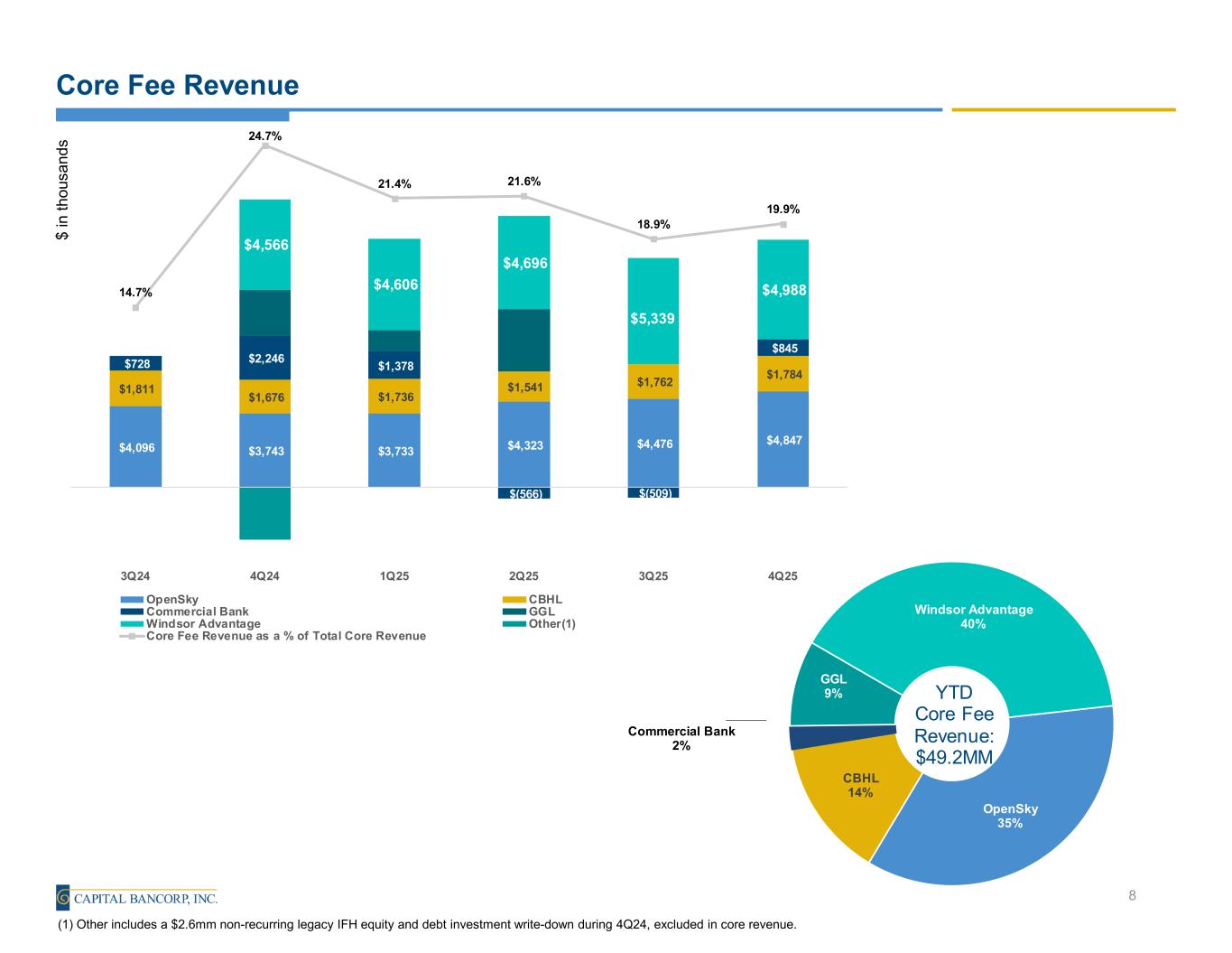 •Fee Revenue (noninterest income) totaled $12.5 million, or 19.9% of total revenue for 4Q 2025, an increase of $1.4 million from 3Q 2025 primarily due to SBIC income, and increased $0.6 million from 4Q 2024