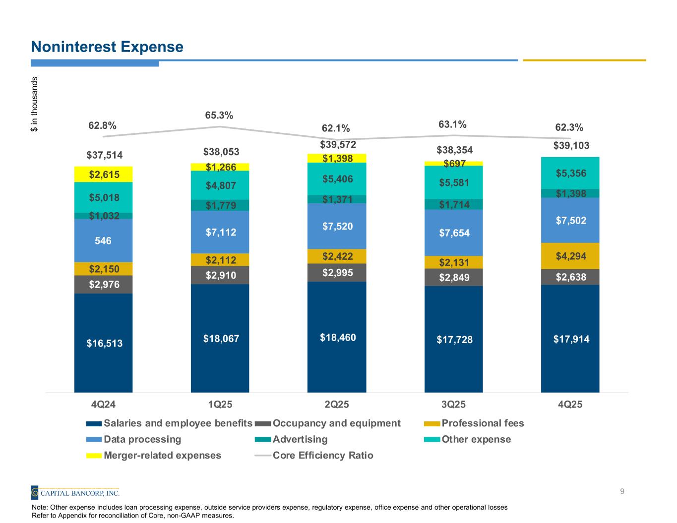 Core Fee Revenue $ in th ou sa nd s 8 (1) Other includes a $2.6mm non-recurring legacy IFH equity and debt investment write-down during 4Q24, excluded in core revenue. Windsor Advantage 40% OpenSky 35% CBHL 14% Commercial Bank 2% GGL 9% YTD Core Fee Revenue: $49.2MM $4,096 $3,743 $3,733 $4,323 $4,476 $4,847 $1,811 $1,676 $1,736 $1,541 $1,762 $1,784 $728 $2,246 $1,378 $(566) $(509) $845 $4,566 $4,606 $4,696 $5,339 $4,988 14.7% 24.7% 21.4% 21.6% 18.9% 19.9% 3Q24 4Q24 1Q25 2Q25 3Q25 4Q25 OpenSky CBHL Commercial Bank GGL Windsor Advantage Other(1) Core Fee Revenue as a % of Total Core Revenue