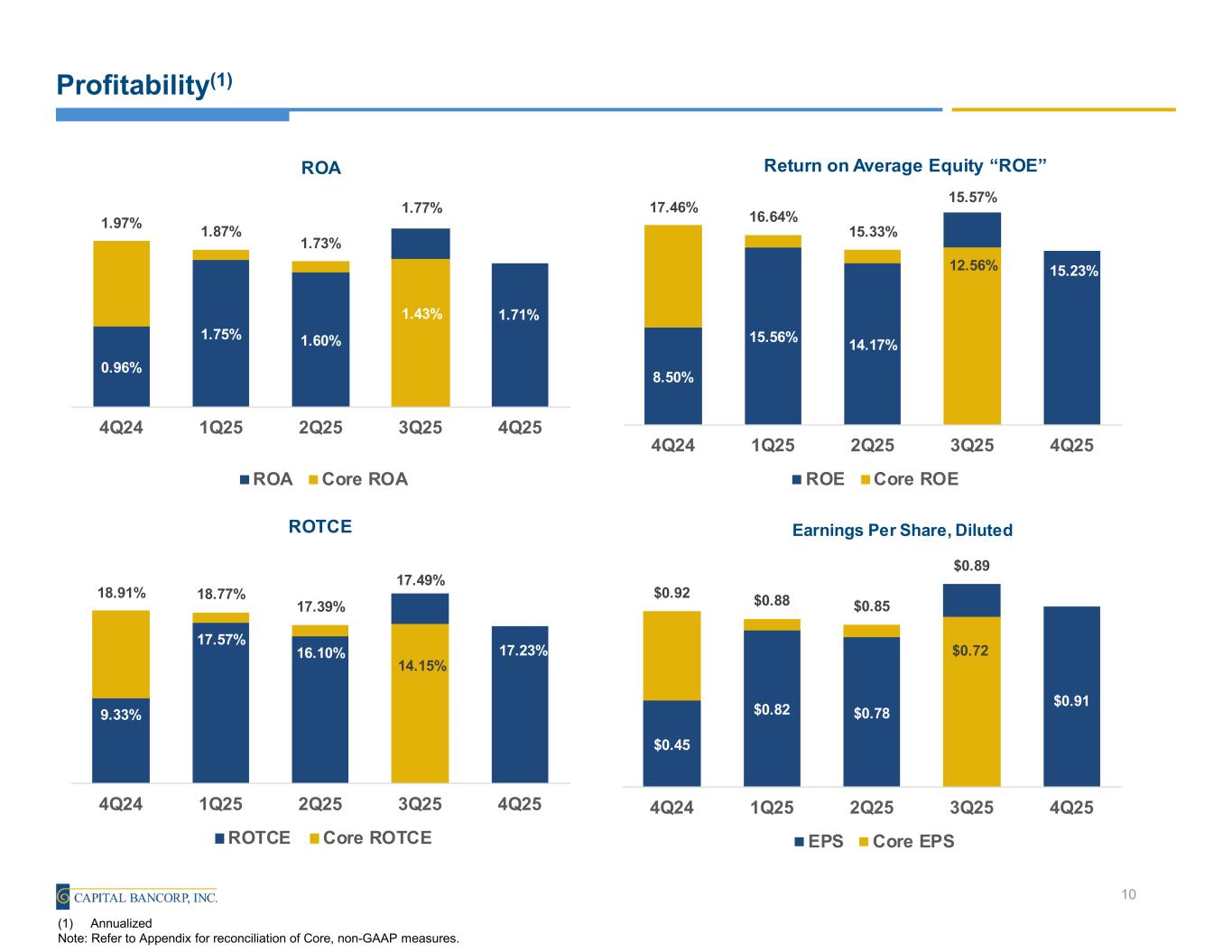 •GAAP Net Income of $15.0 million was flat compared to 3Q 2025. Earnings per share of $0.91 increased $0.02 per share, compared to 3Q 2025 and return on average assets ("ROA") of 1.71% decreased 6 basis points compared to 3Q 2025
