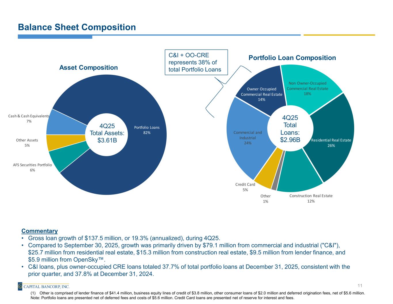 •Gross Loans(2) grew $137.5 million, or 19.3% (annualized), during 4Q 2025, and grew $329.3 million, or 12.5% from 4Q 2024
