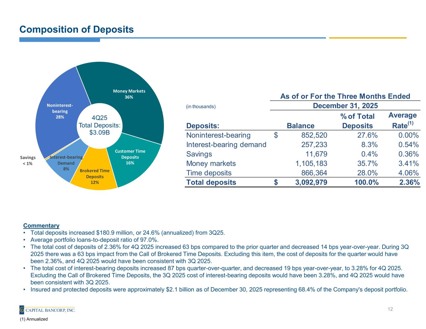•Total deposits grew $180.9 million, or 24.6% (annualized), from 3Q 2025 and grew $331.0 million, or 12.0% from 4Q 2024
