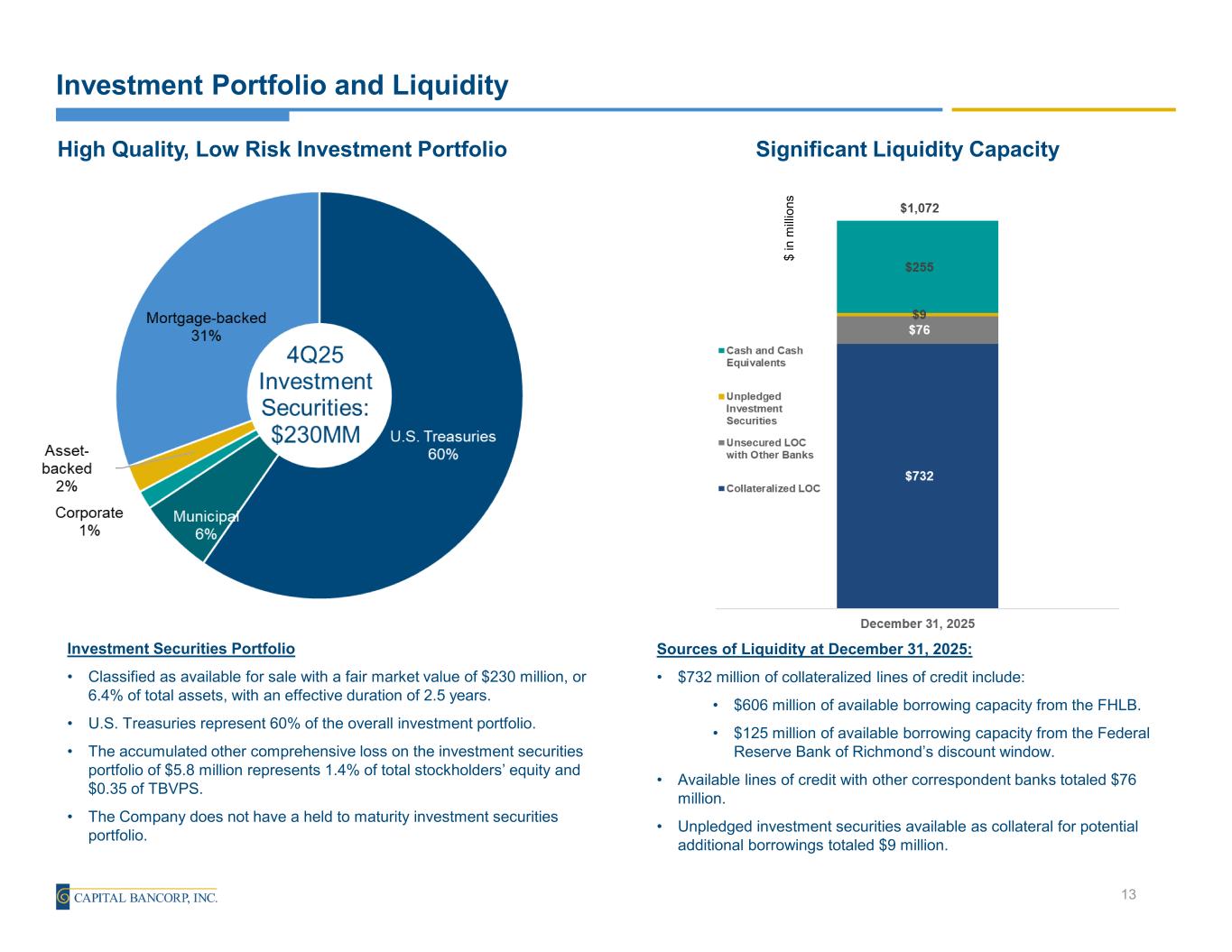 Composition of Deposits Commentary • Total deposits increased $180.9 million, or 24.6% (annualized) from 3Q25. • Average portfolio loans-to-deposit ratio of 97.0%. • The total cost of deposits of 2.36% for 4Q 2025 increased 63 bps compared to the prior quarter and decreased 14 bps year-over-year. During 3Q 2025 there was a 63 bps impact from the Call of Brokered Time Deposits. Excluding this item, the cost of deposits for the quarter would have been 2.36%, and 4Q 2025 would have been consistent with 3Q 2025. • The total cost of interest-bearing deposits increased 87 bps quarter-over-quarter, and decreased 19 bps year-over-year, to 3.28% for 4Q 2025. Excluding the Call of Brokered Time Deposits, the 3Q 2025 cost of interest-bearing deposits would have been 3.28%, and 4Q 2025 would have been consistent with 3Q 2025. • Insured and protected deposits were approximately $2.1 billion as of December 30, 2025 representing 68.4% of the Company's deposit portfolio. 12 (1) Annualized (in thousands) Deposits: Balance % of Total Deposits Average Rate(1) Noninterest-bearing 852,520$ 27.6% 0.00% Interest-bearing demand 257,233 8.3% 0.54% Savings 11,679 0.4% 0.36% Money markets 1,105,183 35.7% 3.41% Time deposits 866,364 28.0% 4.06% Total deposits 3,092,979$ 100.0% 2.36% As of or For the Three Months Ended December 31, 2025Noninterest- bearing 28% Money Markets 36% Customer Time Deposits 16% Brokered Time Deposits 12% Interest-bearing Demand 8% Savings < 1% 4Q25 Total Deposits: $3.09B