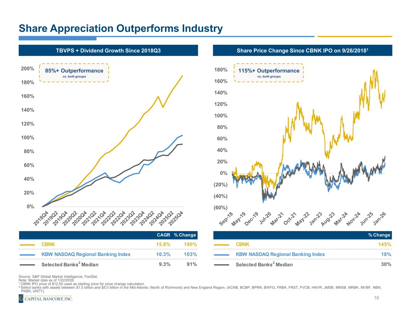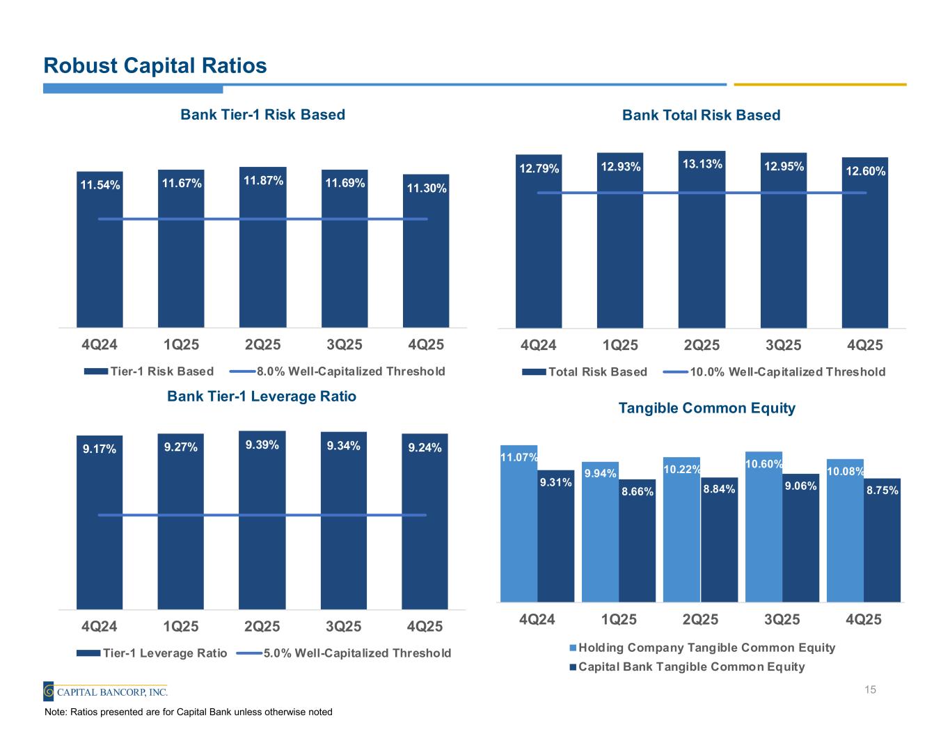Rockville, Maryland, January 26, 2026 (GLOBE NEWSWIRE) – Capital Bancorp, Inc. (the "Company") (NASDAQ: CBNK), the holding company for Capital Bank, N.A. (the "Bank"), today reported net income of $15.0 million, or $0.91 per diluted share, for 4Q 2025, compared to net income of $15.1 million, or $0.89 per diluted share, for 3Q 2025, and $7.5 million, or $0.45 per diluted share, for 4Q 2024. Core net income(1) for 4Q 2025 of $15.0 million, or $0.91 per diluted share, compared to $12.2 million, or $0.72 per diluted share in 3Q 2025, and $15.5 million, or $0.92 per diluted share, for 4Q 2024.