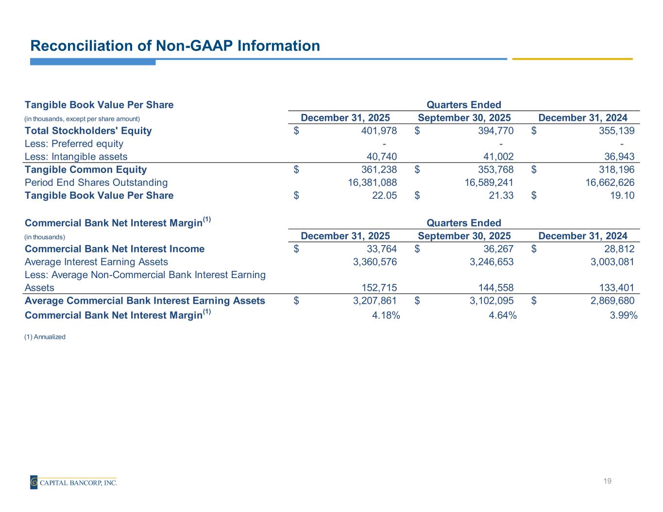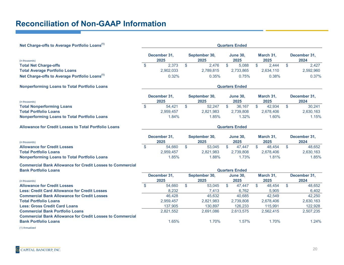 Reconciliation of Non-GAAP Information 19 Tangible Book Value Per Share (in thousands, except per share amount) December 31, 2025 September 30, 2025 December 31, 2024 Total Stockholders' Equity 401,978$ 394,770$ 355,139$ Less: Preferred equity - - - Less: Intangible assets 40,740 41,002 36,943 Tangible Common Equity 361,238$ 353,768$ 318,196$ Period End Shares Outstanding 16,381,088 16,589,241 16,662,626 Tangible Book Value Per Share 22.05$ 21.33$ 19.10$ Commercial Bank Net Interest Margin(1) (in thousands) December 31, 2025 September 30, 2025 December 31, 2024 Commercial Bank Net Interest Income 33,764$ 36,267$ 28,812$ Average Interest Earning Assets 3,360,576 3,246,653 3,003,081 Less: Average Non-Commercial Bank Interest Earning Assets 152,715 144,558 133,401 Average Commercial Bank Interest Earning Assets 3,207,861$ 3,102,095$ 2,869,680$ Commercial Bank Net Interest Margin(1) 4.18% 4.64% 3.99% (1) Annualized Quarters Ended Quarters Ended